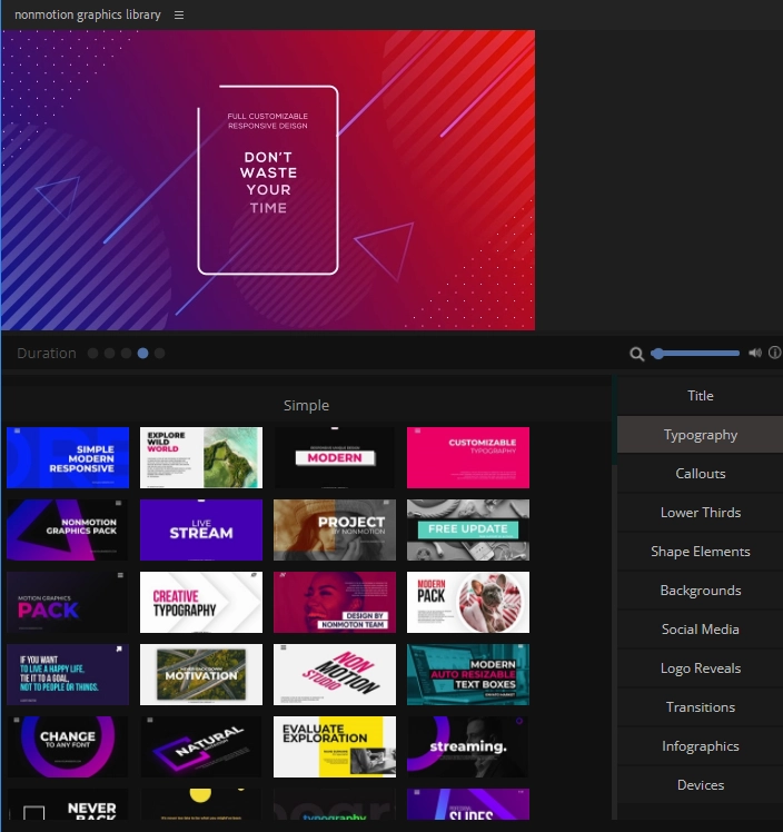 提供了1600多种视频图形元素,包含:海报背景、表情符号、呼出线条标题、设备动画、LOGO动画、字幕条、循环图形动画等。使用Nonmotion Graphics Library扩展脚本可视化调用,需要什么元素双击即可生成。使用简单。