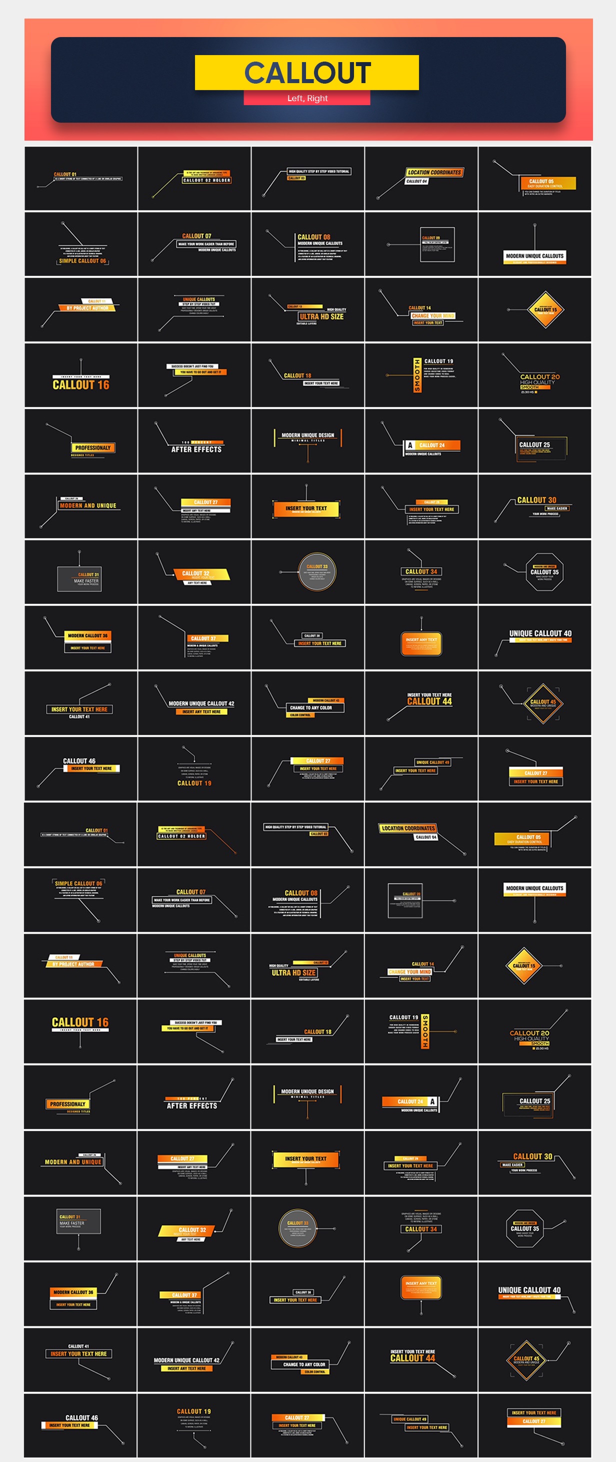 包含1600多种现代创意视频图形动画元素,如海报背景、表情符号、呼出线条标题、设备动画、LOGO动画、字幕条、循环图形动画等。使用Nonmotion Graphics Library扩展脚本可视化调用,需要什么元素双击即可生成。